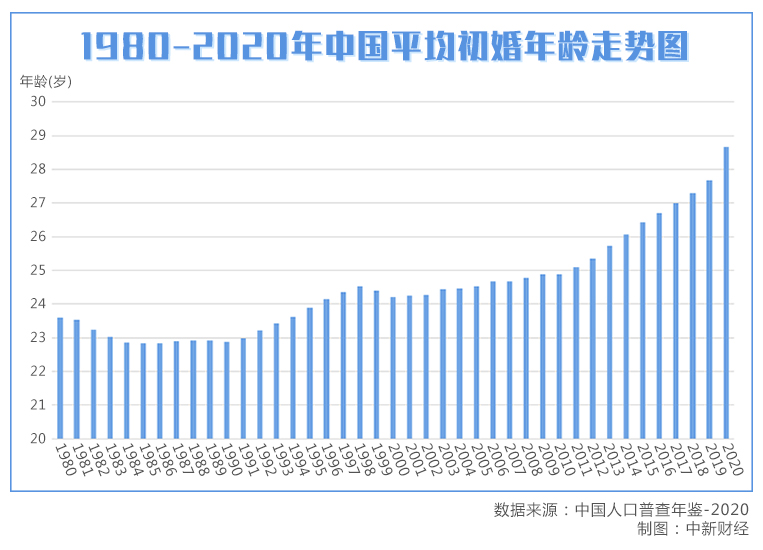 根据《中国人口普查年鉴-2020》,2020年,中国人平均初婚年龄涨到了28.67岁,其中,男性平均初婚年龄为29.38岁,女性为27.95岁。
