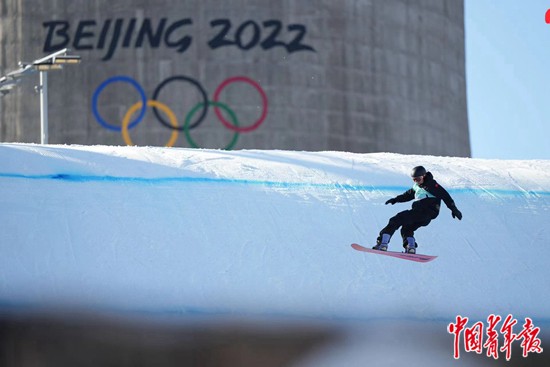 2月14日,北京首钢滑雪大跳台,中国选手苏翊鸣在单板滑雪男子大跳台资格赛上。次日,他获得该项目冠军。 中青报·中青网记者 李隽辉/摄