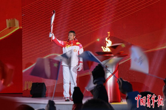 2月2日,北京首钢园,当日首钢园火炬传递的最后一棒火炬手刘博强点燃火炬台。他原本是首钢的轧钢工人,如今是首钢园运动中心运营管理有限公司的制冰工,成为首钢转型职工的代表。 中青报·中青网记者 曲俊燕/摄