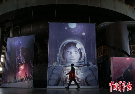 2020年11月1日,北京首钢园三号高炉内部,一名参观者从巨幅的科幻画前经过。当日,2020中国科幻大会在这里开幕。 中青报·中青网记者 陈剑/摄