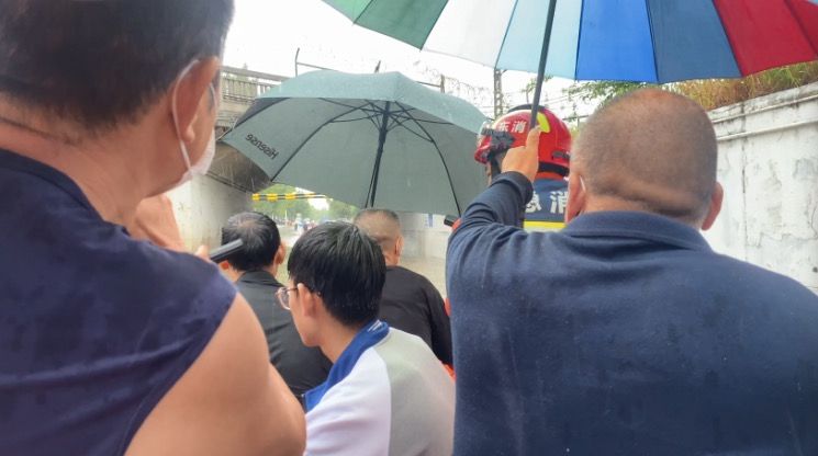 到场后,消防救援人员发现两名考生被困铁路桥南边,着急去学校考试的学生和暂停的公交车在此等候过桥。4名消防站指战员先利用橡皮艇护送2名考生、7名学生及其家长渡过深水区。当橡皮艇快到岸边时,马达无法使用。消防员在齐脖深的水里推着橡皮艇前行。