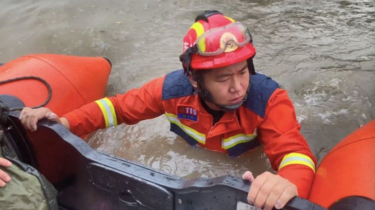 暴雨中,消防员救援现场。山东省消防救援总队供图