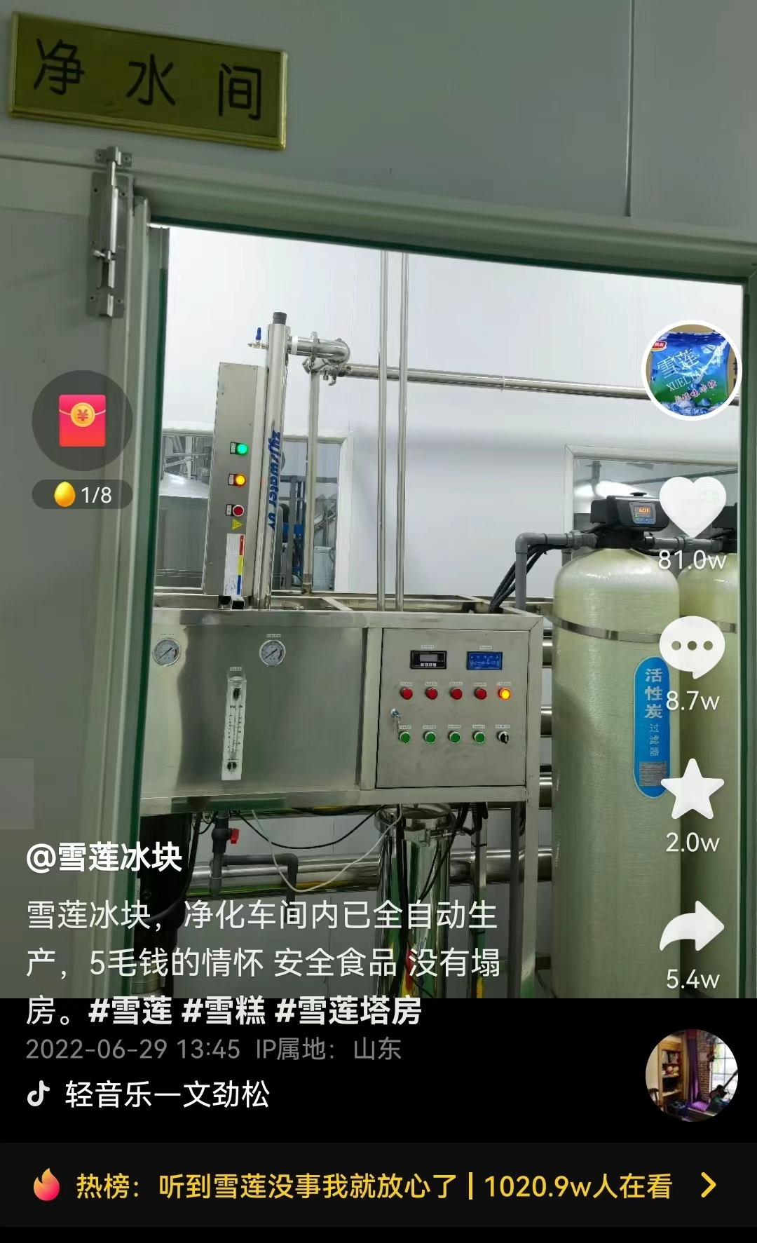 6月29日,沂小蒙临沂电子商务有限公司在抖音注册“雪莲冰块”进行回应,称“净化车间内已全自动生产,5毛钱的情怀,安全食品,没有塌房。”并晒出车间照片澄清。