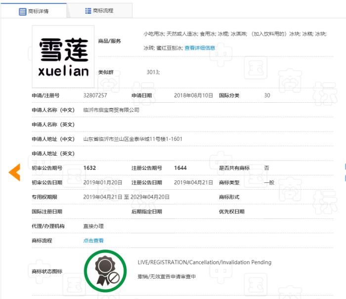 天眼查显示,淄博市临淄雪檬冷饮厂成立于1996年9月,投资人为谢锦亮,经营范围包括冷冻饮品的生产销售。该公司“雪檬雪莲”商标正在申请中,国际分类为30类-方便食品。