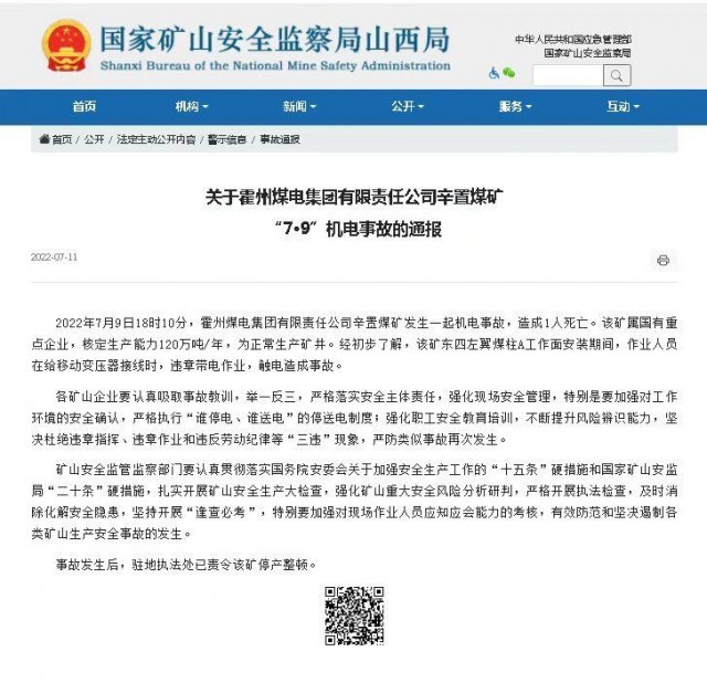 7月11日,国家矿山安全监察局山西局发布通报,2022年7月9日18时10分,霍州煤电集团有限责任公司辛置煤矿发生一起机电事故,造成1人死亡。事故发生后,驻地执法处已责令该矿停产整顿。
