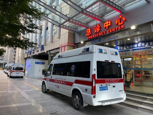 7月13日下午,浙大二院急诊中心外停着多辆急救车。(图片由受访者提供)