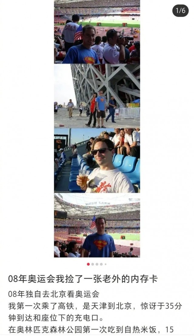 事情的起因是一位网友发布的帖文,内容大致是:他在2008年北京奥运会期间无意间捡到了一位外国人的内存卡,卡里储存了很多记录北京奥运会现场的照片,希望可以找回内存卡的主人。
