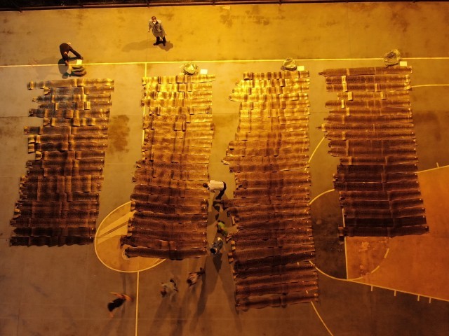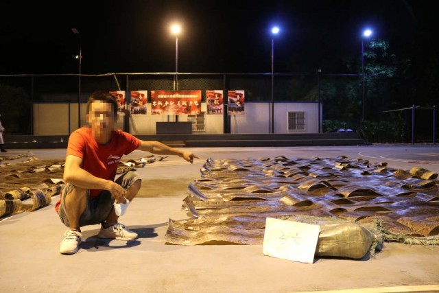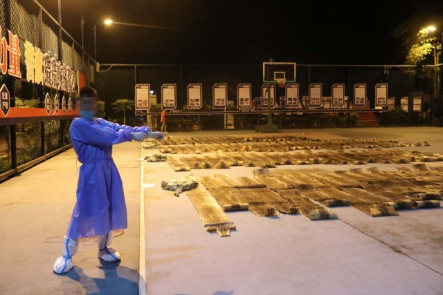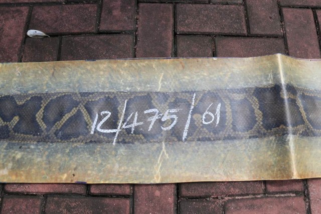 经清点,编制袋内共装有蛇皮可疑物90张,每张保留完整、鳞片紧密、皮质厚实,均长3至4米,最大单皮长达4.25米,查获之物铺开后,粗长的蟒蛇皮铺满了整个篮球场。