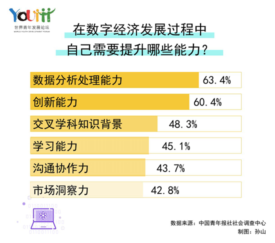 在世界青年发展论坛召开前夕,中国青年报社社会调查中心联合问卷网(wenjuan.com)进行的“青年与数字经济”调查显示(2014人参加),75.1%的受访青年愿意在数字经济领域就业或创业,90.2%的受访青年认同数字经济对人才综合素质提出了更高要求,63.4%的受访青年认为自己需要提升数据分析处理能力。