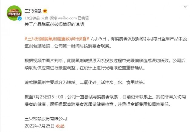 中新网7月25日电 三只松鼠微博25日发布关于产品脱氧剂破损情况的说明,回应“三只松鼠脱氧剂泄露致孕妇误食”的消息。三只松鼠称,7月25日,有消费者发视频称公司每日坚果产品中脱氧剂包装破损,公司第一时间与该消费者联系。