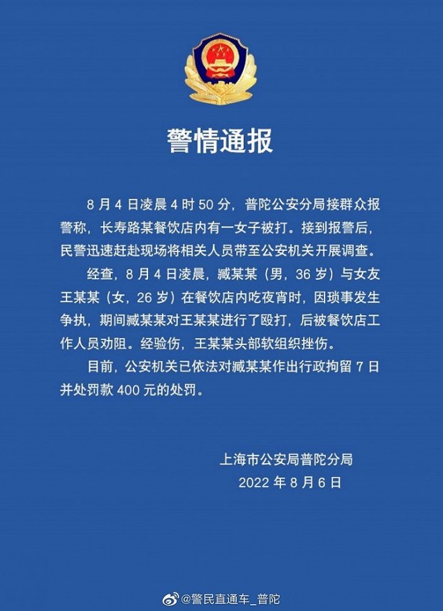 据@警民直通车_普陀 微博消息,上海市公安局普陀分局8月6日发布警情通报,8月4日凌晨4时50分,普陀公安分局接群众报警称,长寿路某餐饮店内有一女子被打。接到报警后,民警迅速赶赴现场将相关人员带至公安机关开展调查。