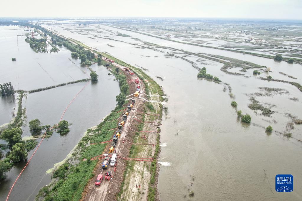 8月7日,抢险人员在辽宁盘锦绕阳河左岸曾经的河堤溃口北段进行排涝作业(无人机照片)。新华社记者 潘昱龙 摄