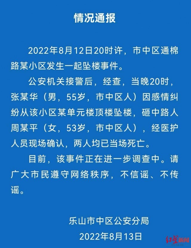 8月12日晚,有网友爆料称,四川省乐山市西农综合市场附近有人跳楼并砸死一名路人。13日,乐山市中区公安分局发布情况通报称,当事男子因感情纠纷坠楼,与被砸路人均当场死亡。