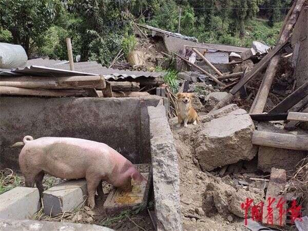 9月10日,王德芳家已经成了一片废墟,她家的猪正吃东西。中青报·中青网记者 赵丽梅/摄