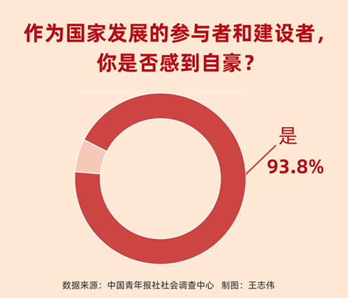 调查显示,成为国家发展的参与者和建设者,让93.8%的受访青年深感自豪。