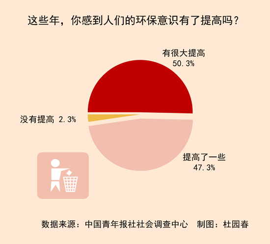 调查中,97.6%的受访者感到,这些年人们的环保意识有了提高,其中超过半数(50.3%)的受访者觉得有很大提高。