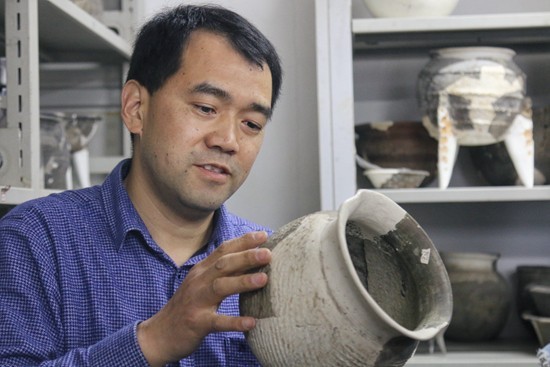 赵海涛与二里头遗址出土陶器。