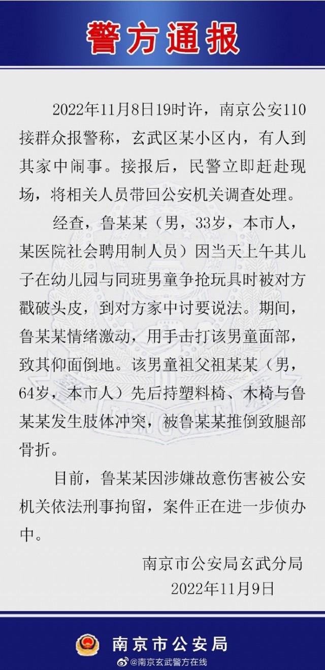 被指“掌掴5岁幼儿,推倒老人致老人右腿骨折”的男子已被南京市警方刑事拘留。