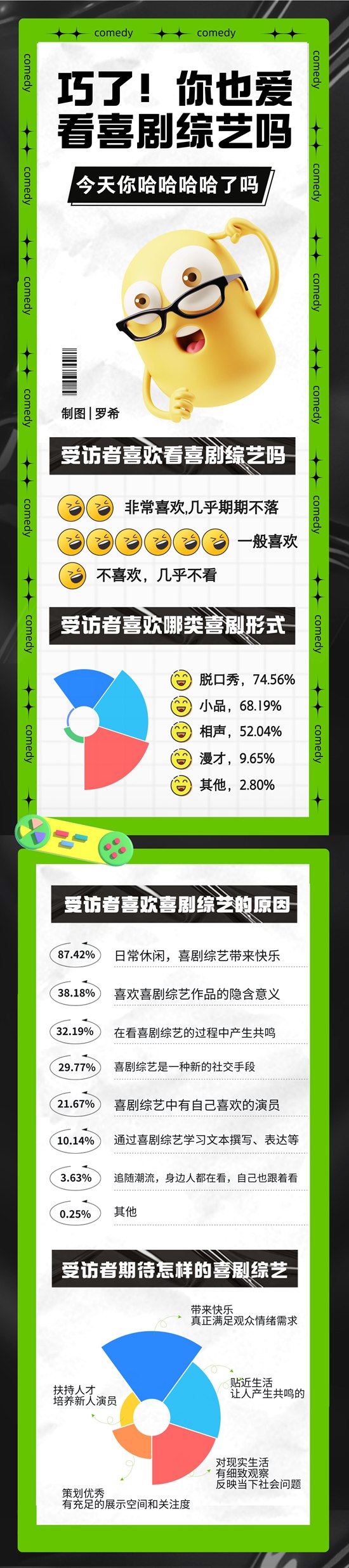 中青校媒调查发现,76.57%受访者期待喜剧综艺带来快乐,满足观众的情绪需求;其次,57.02%受访者期待喜剧综艺贴近生活;55.49%受访者期待喜剧综艺反映生活及社会现状。受访者还期待打造策划优秀的综艺、给喜剧作品充足的展示空间和观众关注度(26.80%);扶持人才,培养出大量新喜剧人才及中坚力量(15.84%)。