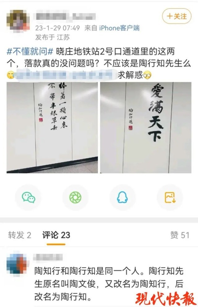 这名市民在网上发出疑问,引起许多网友关注。有网友表示落款没错,“陶知行与陶行知是同一个人。陶行知先生原名叫陶文俊,又改名为陶知行,后改名为陶行知。”还有网友评论“这两句话的原本落款就是‘陶知行’,不是‘陶行知’。”
