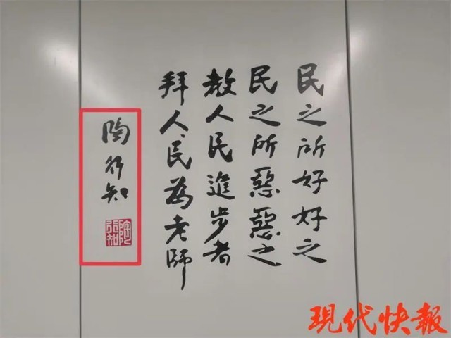 近日,有南京市民路过地铁1号线晓庄地铁站2号口通道时,留意到墙上“爱满天下 ”“捧着一颗心来,不带半根草去”的落款是“陶知行”,不禁产生疑惑:不应该是陶行知吗?