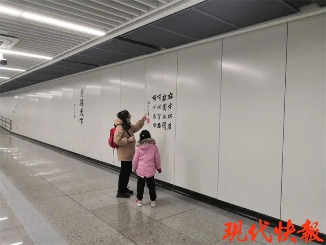 △南京市民李女士正在将文化墙上的作品读给女儿听