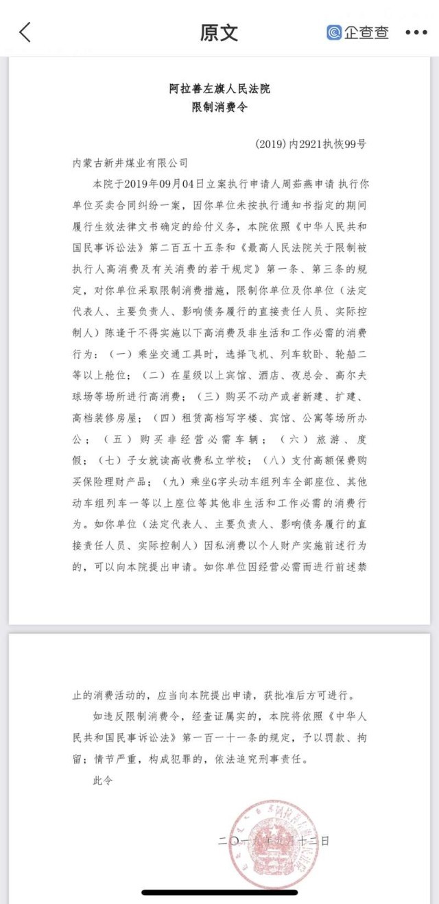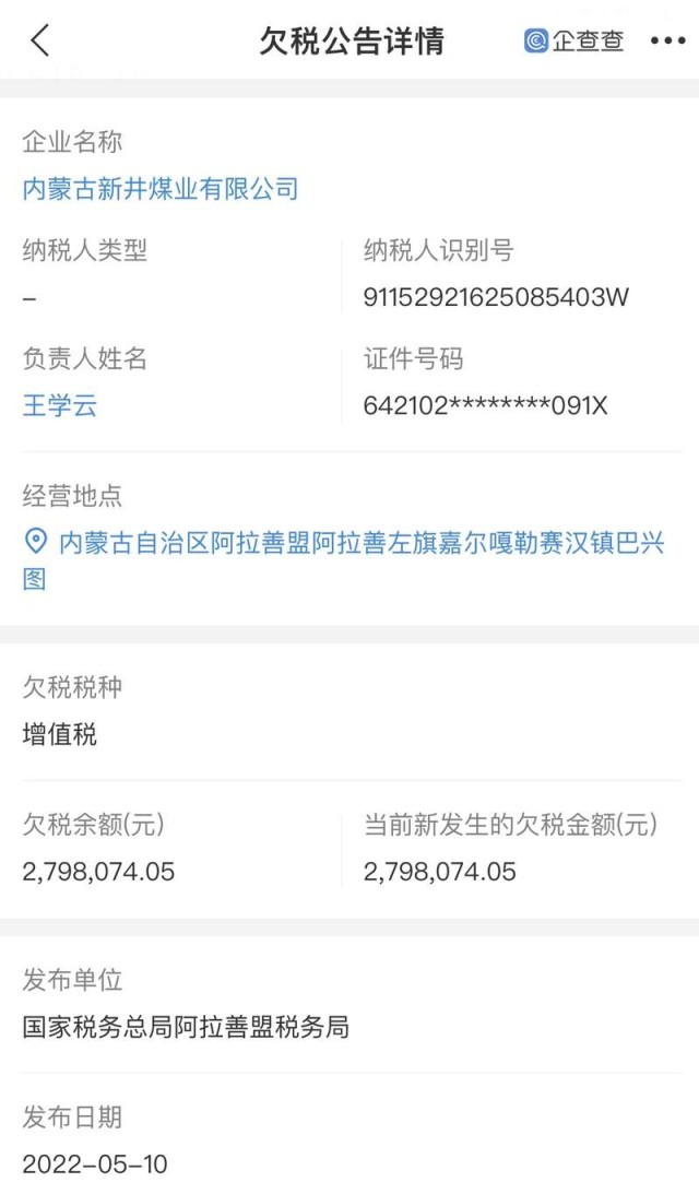 内蒙古新井煤业有限公司于1999年登记成立,目前法定代表人为王学云。企查查平台显示,该公司多次涉及买卖合同纠纷、租赁合同纠纷、借款合同纠纷等,后被法院列为失信被执行人,公司法定代表人也曾多次被法院限制高消费。