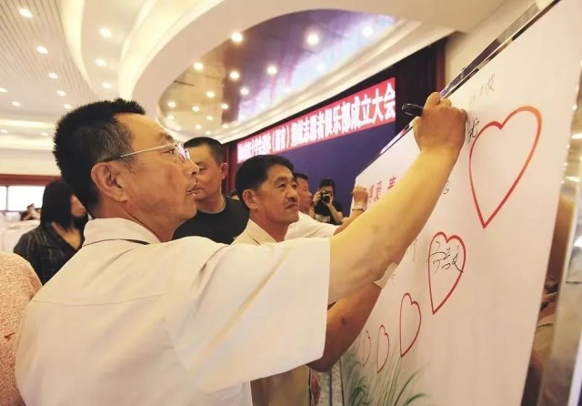 △2010年6月,郭明义在遗体(器官)捐献志愿者的捐献承诺签字板上签名。