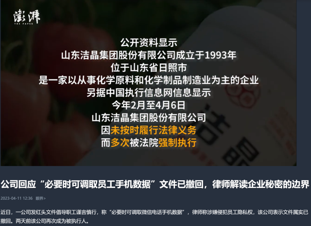 据上游新闻,4月7日,山东洁晶集团股份公司相关负责人回应称,“文件属实,这个文件的目的是为了加强员工的保密意识,但是由于在文件拟稿还有审核的时候把关不严,这个表述非常不恰当。第一时间我们发现这个事情之后,就把文件做了撤回,同时对相关人员进行了批评教育。这件事情确实是我们做错了,我们感谢新闻媒体的监督,以后一定要加强员工的法律学习,避免这种事情再次发生。”