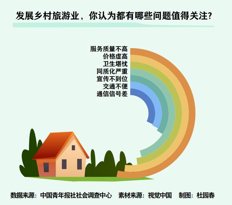 “卫生问题也需要重视。”张璇感觉乡村旅游卫生问题一是缺乏管理,二是一些游客不自觉。她去过一个临海乡村景点,水面上都能看到人们扔下的垃圾。“希望景区加强管理,同时游客提高出行素养,保护环境人人有责。”