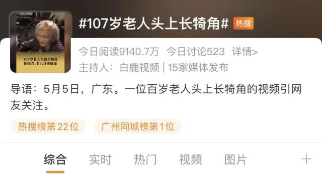 5月5日,广东韶关一位百岁老人头上长犄角的视频引网友关注,相关话题登上同城热搜第一位。