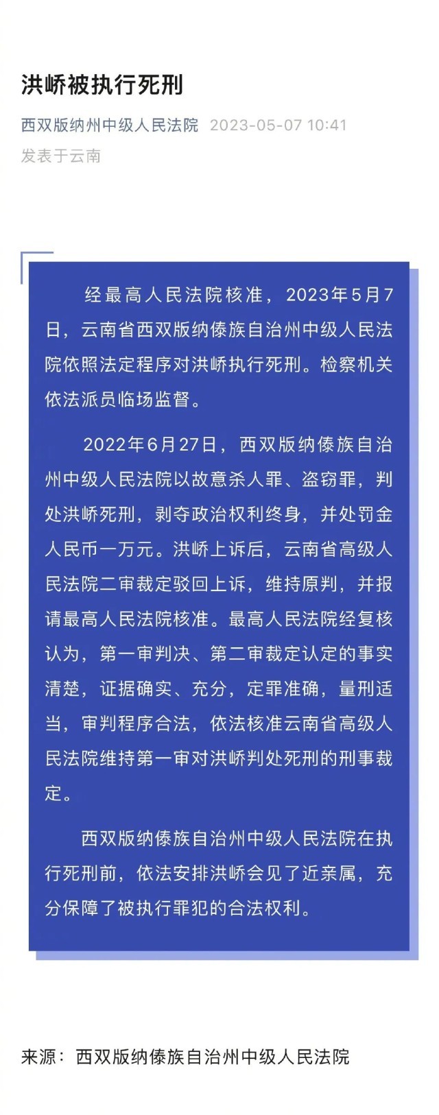 经最高人民法院核准,2023年5月7日,云南省西双版纳傣族自治州中级人民法院依照法定程序对洪峤执行死刑。检察机关依法派员临场监督。
