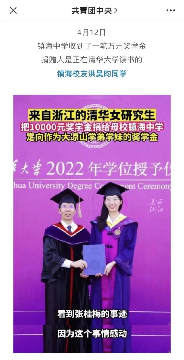 上个月,有消息称,洪昊昀正在清华大学读研,刚刚申读博士成功,给母校镇海中学捐了一笔万元奖学金,定向捐给在镇海中学就读的四川大凉山2022级学生。
