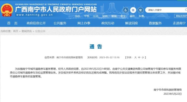 央视网消息:据南宁市政府网站消息,南宁市市政和园林管理局发布通告,为加强南宁市城市道路停车服务管理,经市人民政府同意,自2023年5月22日14时起,由南宁公共交通集团有限公司接管南宁市慧泊停车场服务有限责任公司城市道路停车泊位运营管理业务。涉及相关软件系统及标识将在近期完成调整。该局将同步按法定程序开展经营管理主体变更工作,并加强对城市道路停车服务的监督管理。