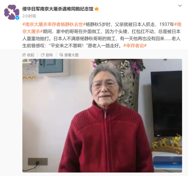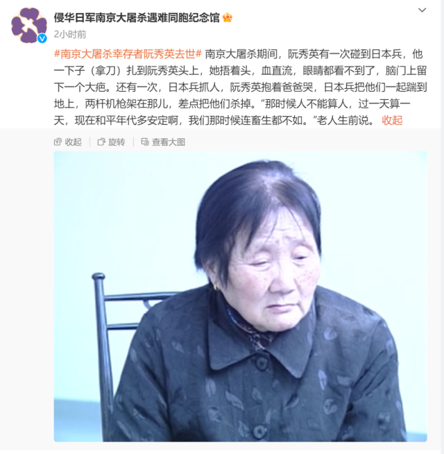 近日,南京大屠杀幸存者阮秀英、杨静秋相继去世。