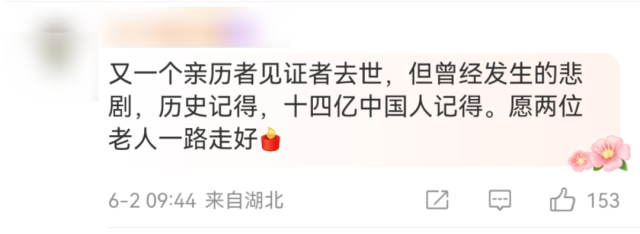 得知两位老人去世的消息后,有网友留言:“不能因为这些人的离去,就淡忘这段历史”。