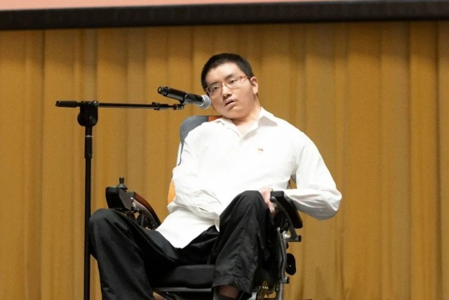 清华无障碍协会举办公益活动,邀请大家体验坐轮椅游清华。(左三为朱晓鹏)