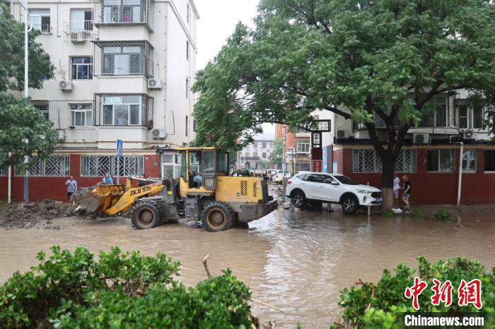 8月1日,北京市门头沟区桥东街,工程车辆在街道清淤。 中新社记者 盛佳鹏 摄