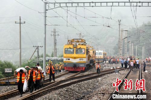 8月1日,北京门头沟区,丰沙铁路妙峰山镇水峪嘴村段,工作人员前往铁路线清淤抢修。7月29日以来,北京地区持续强降雨,西南部降雨量大。受降雨影响,北京丰台至沙城铁路(丰沙线)严重水害。 中新社记者 盛佳鹏 摄