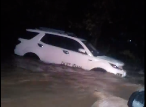一男子驾车涉水过桥
