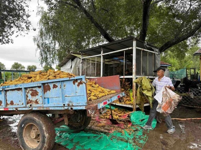 8月7日,舒兰市七里乡杨家村,徐海祥和儿子正在冲洗苞米。中青报·中青网记者 张均斌/摄