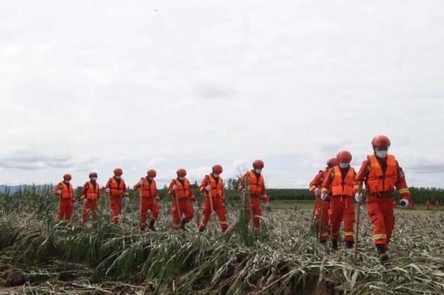 8月8日,吉林省森林消防总队吉林市支队任务分队划分9个救援小组,担负七里乡董家街霍伦河流域沿岸搜救任务。侯博文/摄