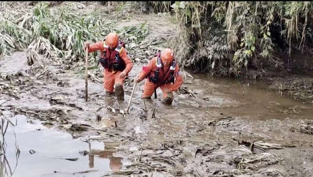 很难说暴雨冲刷后的河床有真正安全的地方。湍急水流、混浊河水、众多淤泥和沙子,还有顺水而下的种种不明物,任何一样都可能给救援人员带来致命威胁。姚汉清手拿一根1米5左右的竹棒探路,一点点往河流对岸挪动,可还是遇到了多次险情。