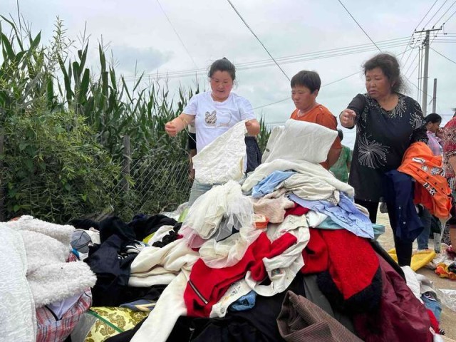 8月7日,一批爱心物资到了三合村,村民挑选衣物。中青报·中青网记者 张均斌/摄