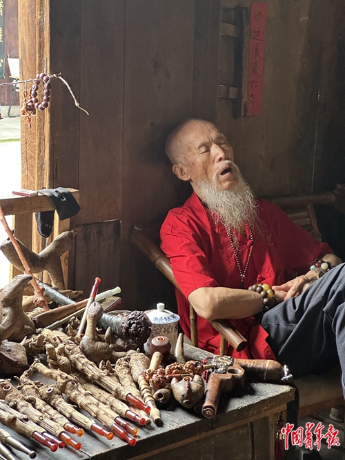 2014年,罗大爷成了茶馆的一个角儿。他原本只是到女儿家小住,在茶馆喝茶时,被李强鼓励售卖自制的“烟杆”,“给你一个座位,不收茶位费”。试营业了几天,生意不错,罗大爷留了下来。每年国庆节后,他回老家,满山遍野寻找树根制作烟杆,第二年开春又来到老茶馆卖。他还做了一根3米长的烟杆,想挑战吉尼斯世界纪录。李强说,罗大爷每一笔收入,都打到儿女的微信账户上,补贴晚辈。