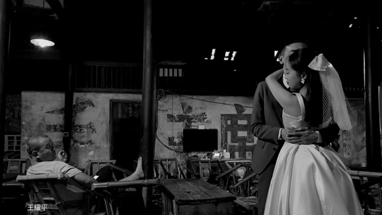 年轻人在老茶馆拍婚纱照,一旁的老茶客翘着脚旁观。王耀平/摄