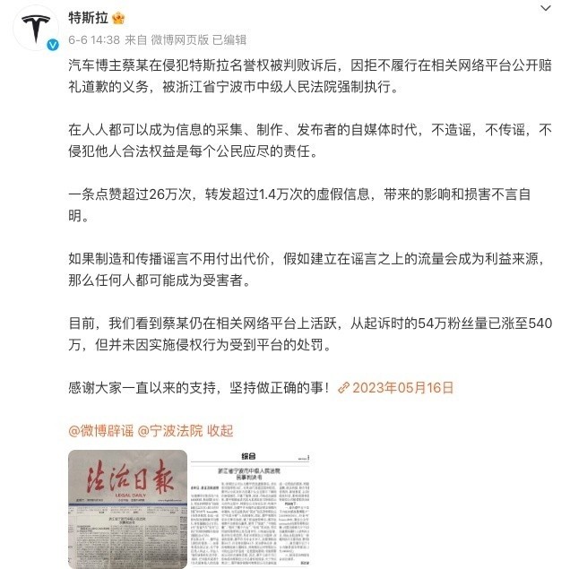2022年,宁波中级人民法院判决结果显示,法院认定“蔡老板”视频内容并无事实依据,属于捏造虚假事实。“蔡老板”应向特斯拉赔礼道歉,并赔偿特斯拉侵权损失10万元。今年6月6日,特斯拉官方微博发文称,全网粉丝近700万的汽车博主蔡某因拒不履行公开赔礼道歉义务,被宁波市中院强制执行。