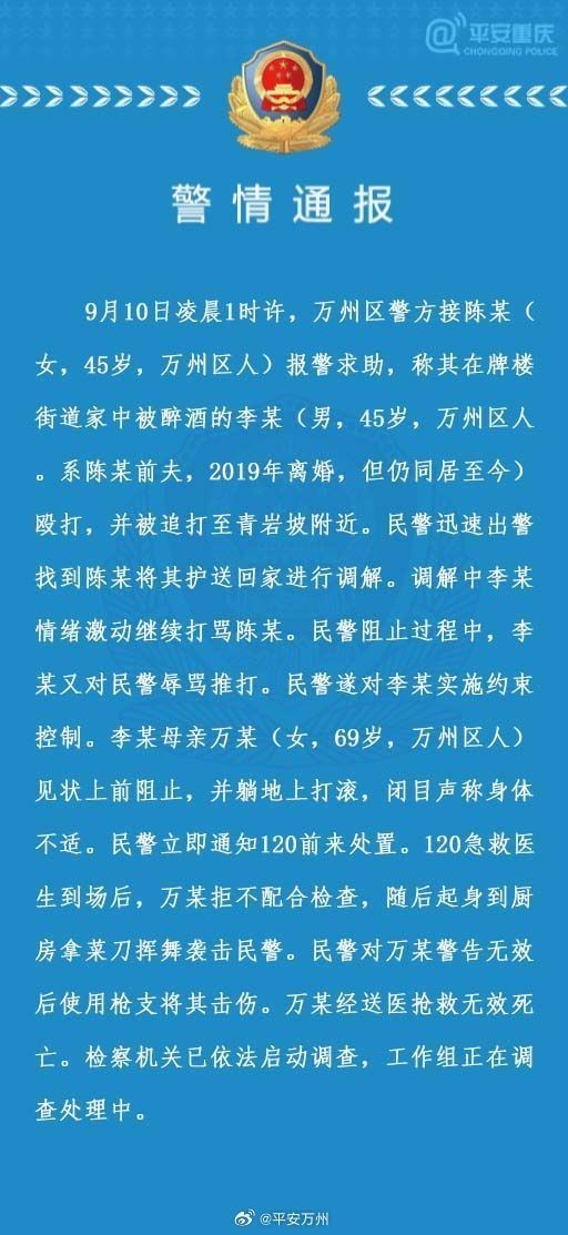 9月10日凌晨1时许,万州区警方接陈某(女,45岁,万州区人)报警求助,称其在牌楼街道家中被醉酒的李某(男,45岁,万州区人。系陈某前夫,2019年离婚,但仍同居至今)殴打,并被追打至青岩坡附近。民警迅速出警找到陈某将其护送回家进行调解。调解中李某情绪激动继续打骂陈某。民警阻止过程中,李某又对民警辱骂推打。民警遂对李某实施约束控制。李某母亲万某(女,69岁,万州区人)见状上前阻止,并躺地上打滚,闭目声称身体不适。民警立即通知120前来处置。120急救医生到场后,万某拒不配合检查,随后起身到厨房拿菜刀挥舞袭击民警。民警对万某警告无效后使用枪支将其击伤。万某经送医抢救无效死亡。检察机关已依法启动调查,工作组正在调查处理中。