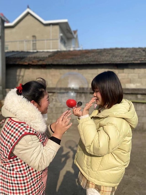 胡玥倩(右)和学生在玩耍。沃先桃/摄