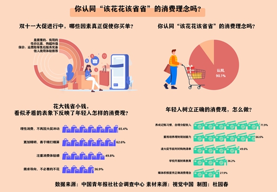 上周,中国青年报社社会调查中心联合问卷网(wenjuan.com),对1000名青年进行的一项调查显示,90.1%的受访青年认同“该花花该省省”的消费理念。65.4%的受访青年觉得年轻人更加理性消费了,不再因大促冲动。